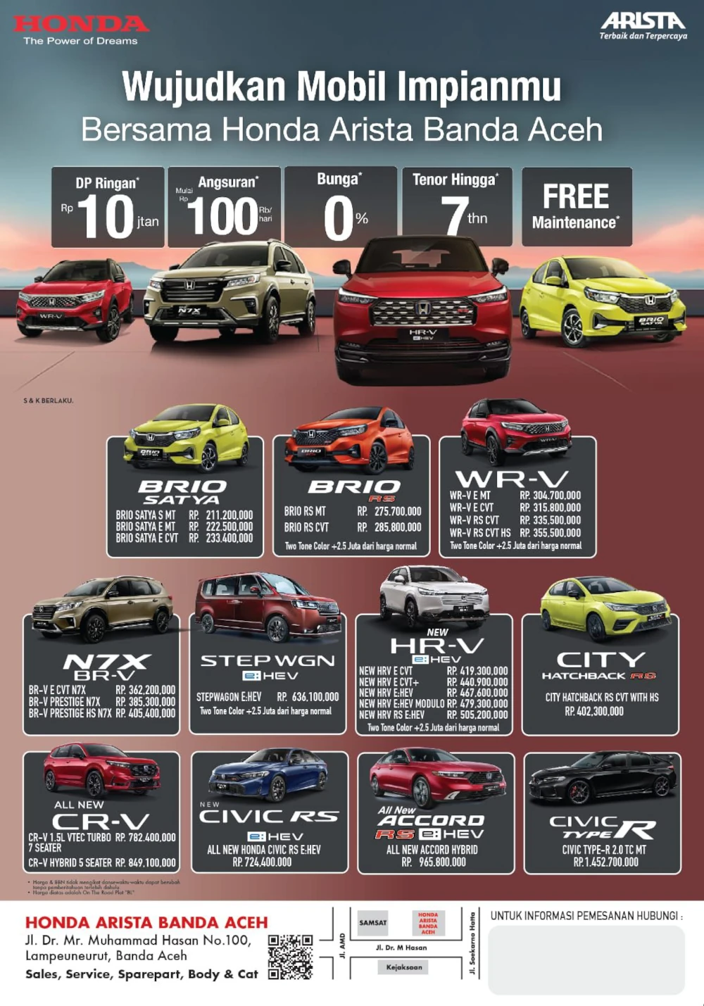 Harga Mobil HondaBerikut ini harga mobil Honda terbaru Dealer Resmi Honda Arista Banda Aceh Sales Terbaik KamiAYU NADIA(Sales Counter)+62 853 7314 1376 Hubungi AYU